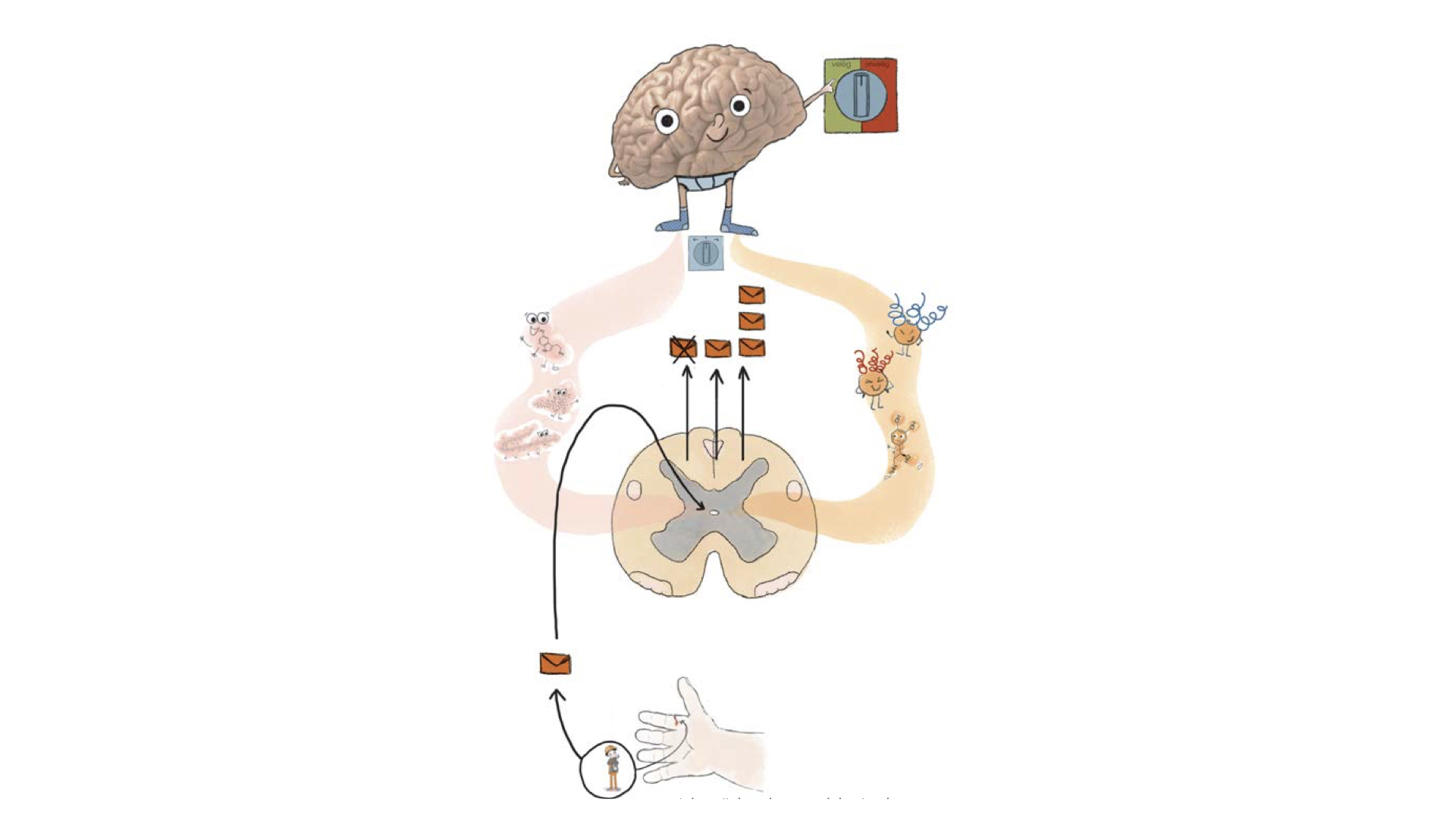 Het pijnsysteem is één van de vele interne lichaamssystemen, net zoals het spijsverteringssysteem. Receptoren registreren of er ergens schade is die herstelt moet worden en het brein neemt dit waar en zorgt voor actie als dit nodig is. Pijn is goed en helpt ons veilige keuzes te maken. Dit noemen we centrale pijninhibitie.