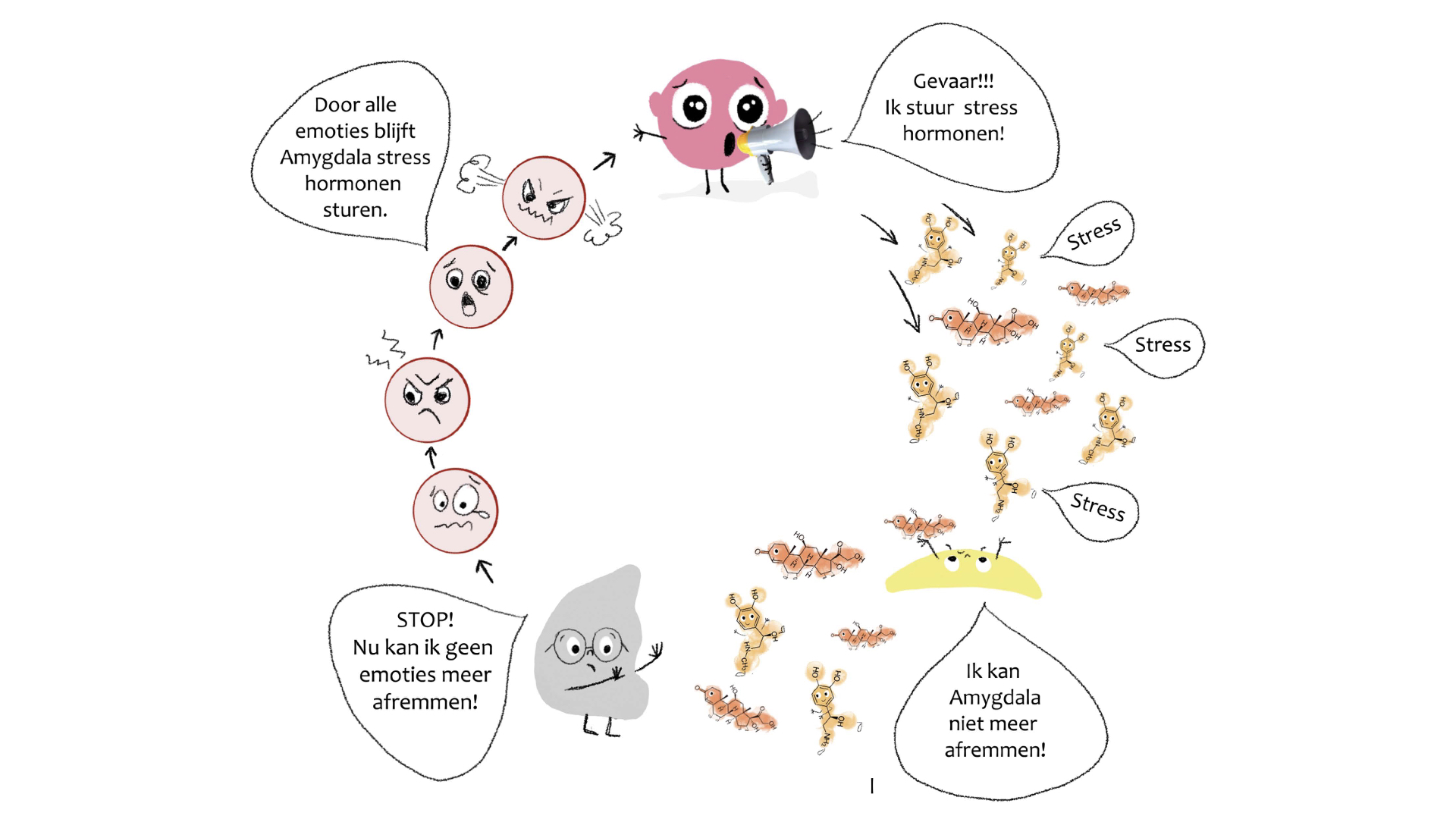 Bij langdurige blootstelling aan spanning of stress kan dit systeem ook sensitiseren. Normaal gesproken reageert de amygdala als eerste op gevaar. De prefrontale cortex en hippocampus reageren met een weloverwogen besluit of dit gevaar wel noodzakelijk is. Als dat zo is wordt de hypofyse geactiveerd waarbij er, met de bijnieren, stresshormonen zoals cortisol en adrenaline wordt aangemaakt. Dit zorgt ervoor dat je uiteindelijk in actie komt. De hippocampus onthoudt deze actie waardoor het gevaar de volgende keer wordt herkend.