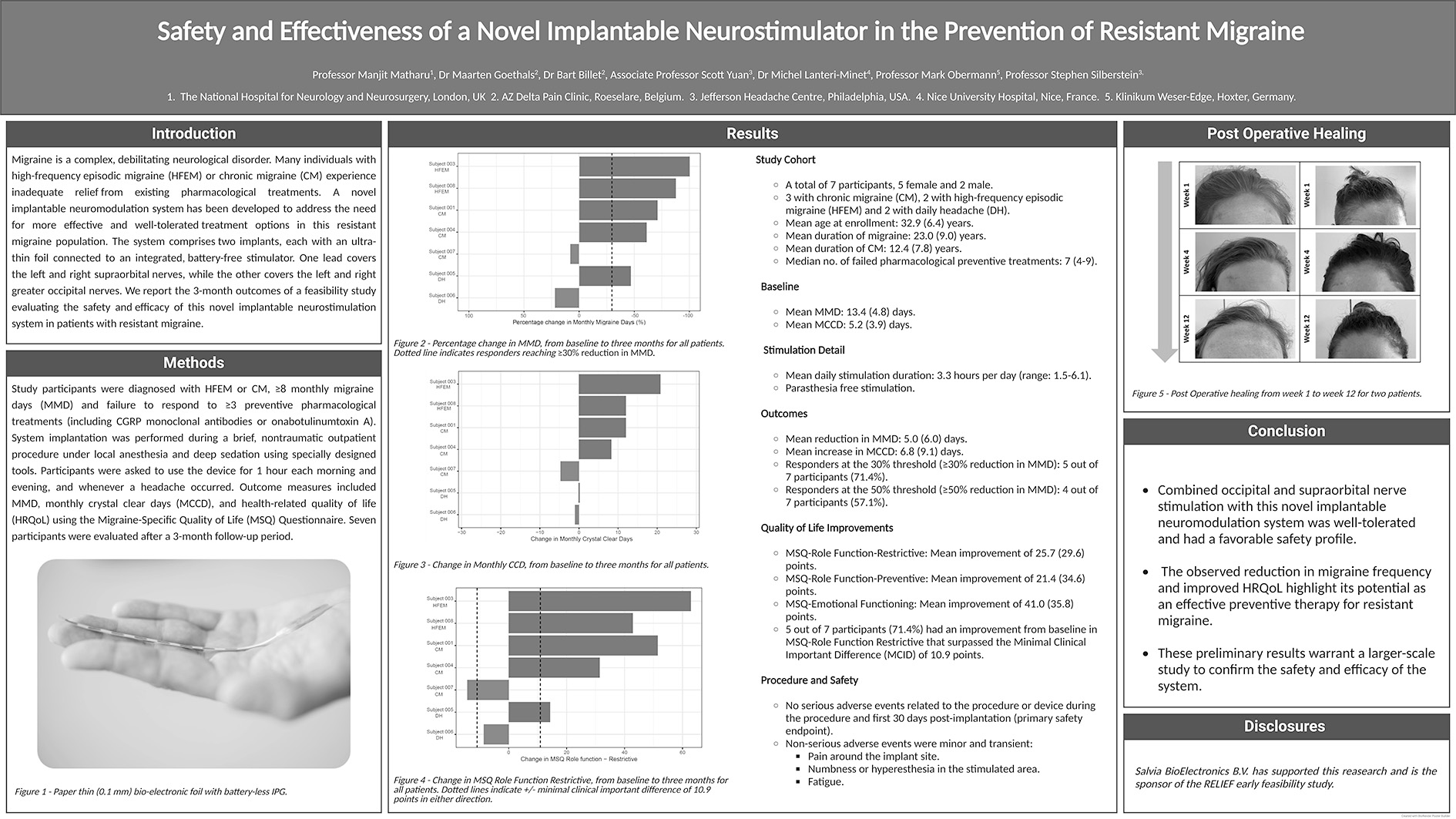 Het neuromodulatie-implantaat van Salvia BioElectronics wordt onderzocht in twee klinische trials: RELIEF (een open label pilot met 7 patiënten) en RECLAIM (een gerandomiseerde, dubbelblinde studie met een beoogde N van 62). De RELIEF-studie toonde een daling in migraineaanvallen en een verbeterde kwaliteit van leven.1 Hoewel bemoedigend, betreft het hier slechts een zeer kleine groep. De RECLAIM-studie is nog lopende, van de 62 beoogde patiënten zijn er momenteel ongeveer 20 geïncludeerd.2 Tussentijdse resultaten worden pas rond 2027 verwacht.